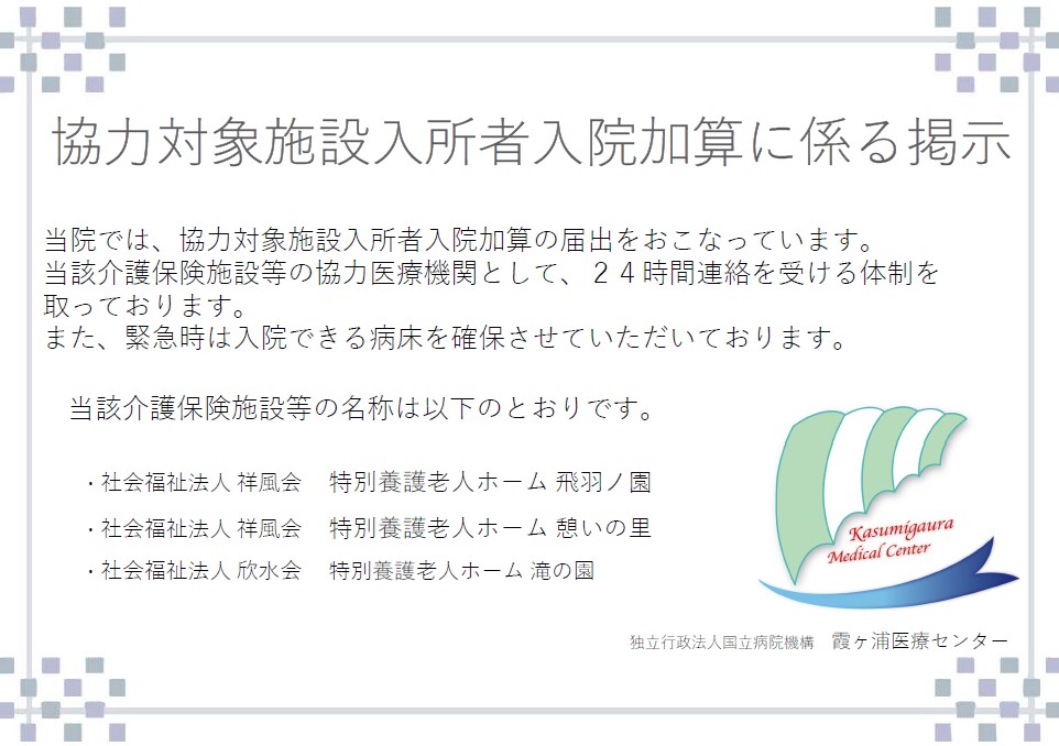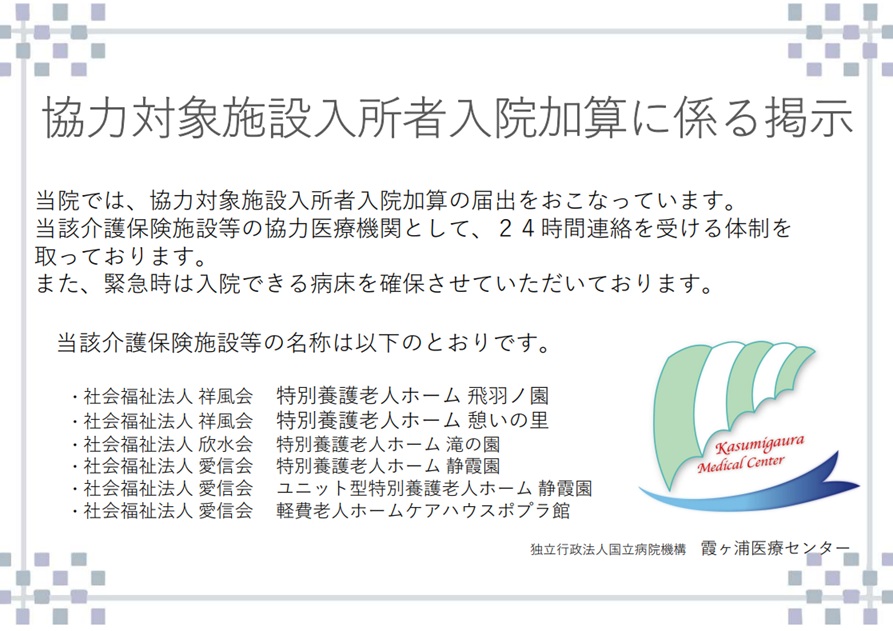 協当院は、介護保険施設等に協力医療機関として定められており、当該介護保険施設等において療養を行っている患者さまの病状の急変等に対応いたします。
