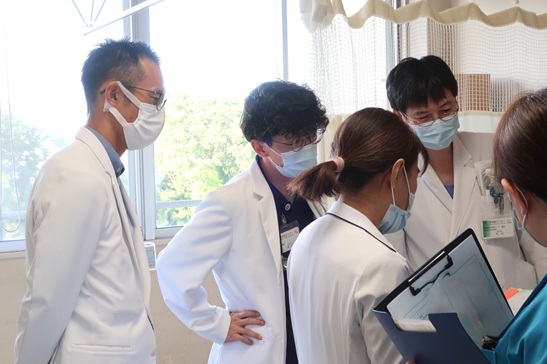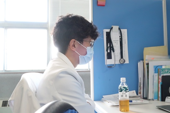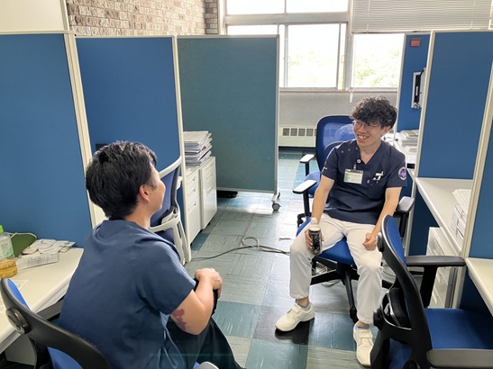 研修医とはいえ一人の医師として臨床上の判断を下すためには自ずと各種の診察を自分で行い、必要な検査や処方をオーダーし、その結果をもとに次の一手を考えることになりますが、迷うことや判断しかねることがあれば、どの先生方も別け隔てなく丁寧に教えて下さいます。患者さんやご家族とのコミュニケーションの取り方が特に素晴らしい先生もいて、そのスタイルからも学びつつ、自分なりの患者さんやご家族の状況や個性に合わせたコミュニケーションの取り方を毎度模索しています。また、病棟では毎日、看護師、理学療法士、言語聴覚士、臨床工学技師、薬剤師、管理栄養士、作業療法士、診療放射線技師、臨床検査技師、そして医療ソーシャルワーカー等の皆さんとやり取りしながら、医師という立場に求められることは何か、自分が責任を持つべき専門性とは何か、多職種が上手に嚙み合っていくために医師はどうあるべきか、個別の事例を通して少しずつ具体的に学んでいるように思います。先を読んだオーダーや指示を的確に出せるようになりたいと思うのですが、そういう点でも周囲のドクターだけでなく経験豊かな多職種の皆さんからも学ぶことがとても多いです。